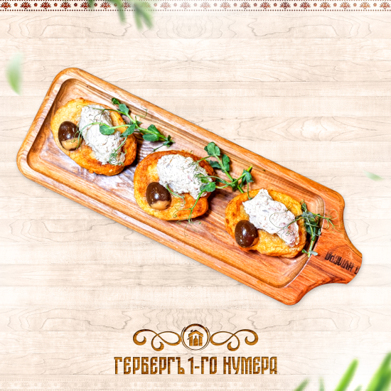 Ржаные оладьи с форшмаком из скумбрии и маринованным перепелиным яйцом