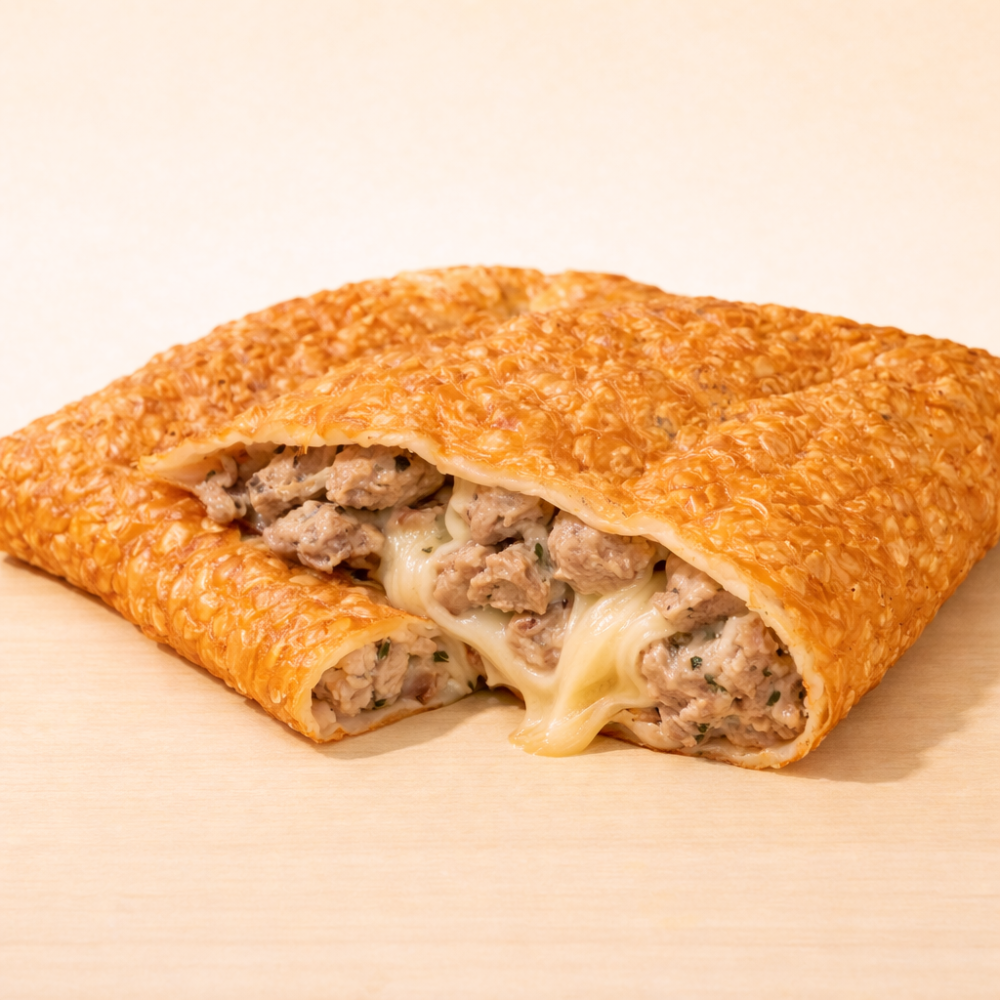 Индейка и расплавленный сыр — насыщенная начинка в хрустком чебуреке.