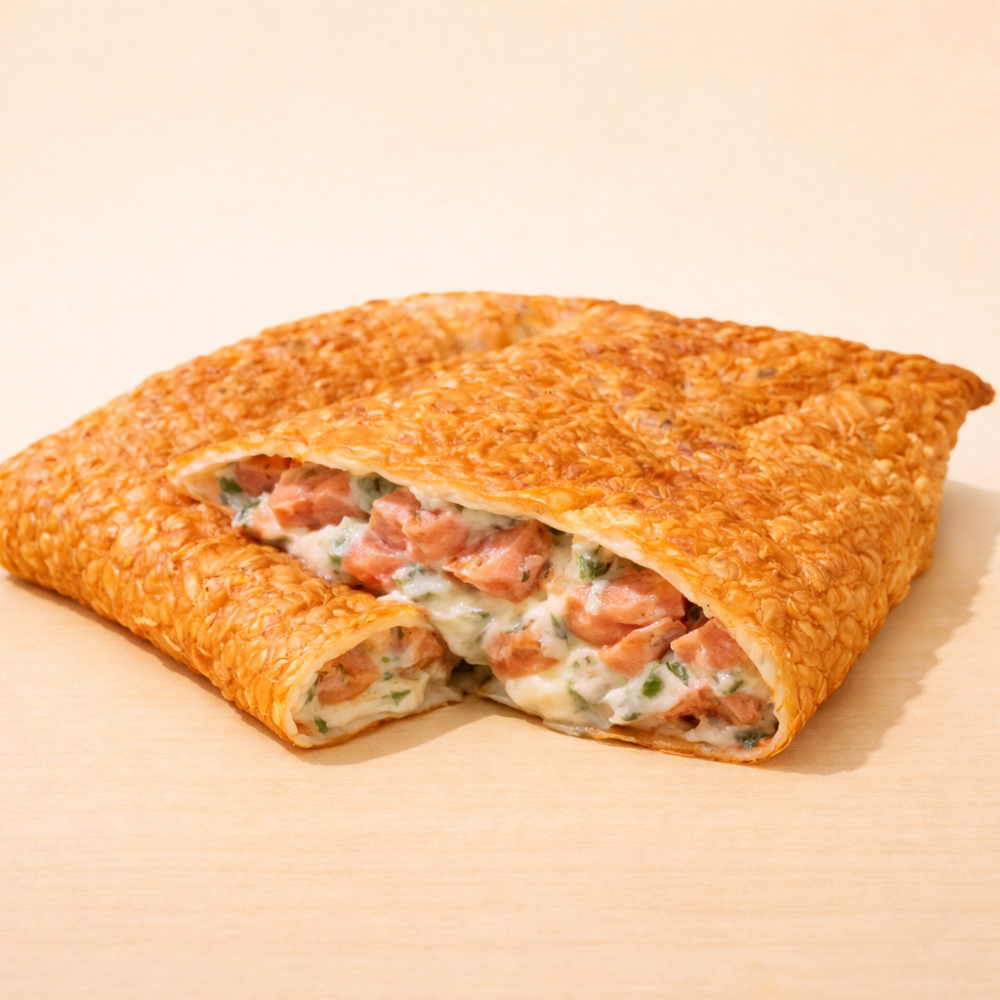 Форель и творожный сыр — нежная, сбалансированная начинка с деликатным рыбным вкусом в хрустком чебуреке.