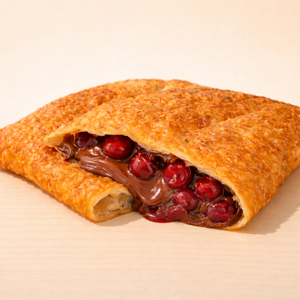 Шоколадная паста и вишня — тёплая десертная начинка с насыщенной сладостью и лёгкой ягодной кислинкой в хрустком чебуреке.
