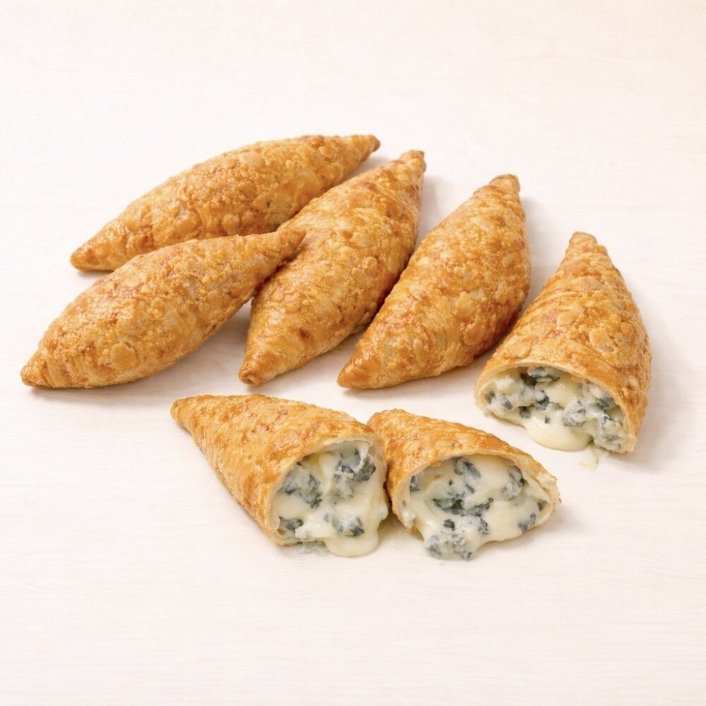 Треугольные гылуны ручной лепки с начинкой из моцареллы и дор-блю — тягучий сливочный вкус с выразительной сырной нотой.