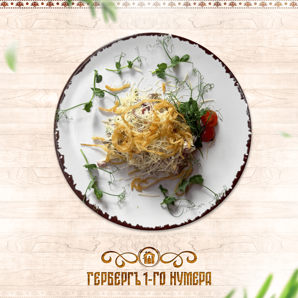 Сытный салат с отварной говядиной, картофелем, яйцом, корнишонами, маринованным луком и хрустящим луком фри.